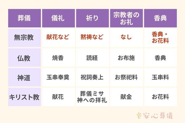 各宗教の葬儀と無宗教の葬儀の違いには主に以下があります。
