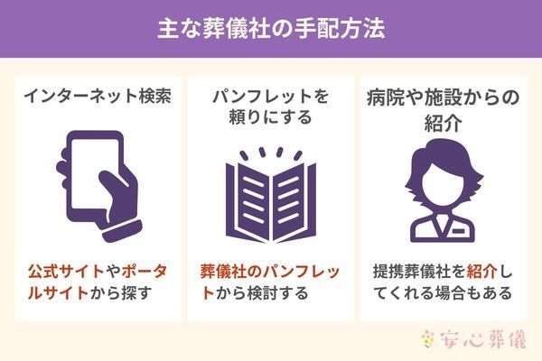 この見出しでは亡くなられた場所ごとに、葬儀社の手配方法を解説していきます。ただ、前提としてどの場所でもインターネット検索が主流の1つになることを、念頭に置いておくといいでしょう。