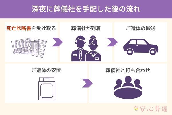 葬儀社は、医師の死亡診断書がなければ、ドライアイスをあてるなどのご遺体保全処置ができません。死亡診断書がまだ出ていなければ、今どのような状況なのか医師の診断の予定時刻などを電話で伝えてください。