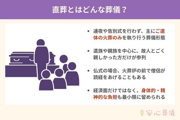 直葬とは通夜・告別式を行わず、火葬のみを執り行う葬儀形態です。火葬当日は短時間で終了し、費用が抑えられるため、遺族の経済的、身体的、精神的負担が少ないのが特徴です。