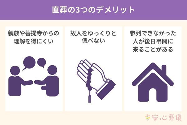 - 簡略的な葬儀のため、遺族の負担を心身ともに軽減できる一方、周囲に理解されないリスクもある