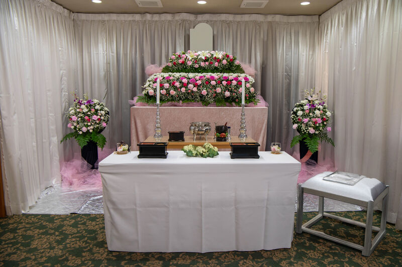 「白木祭壇は目立たせたくない」というご希望に合わせ、柔らかなドレープ幕で背景を整え、ピンクと白を主役にし...