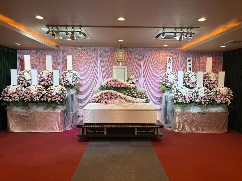| 葬儀社の担当者コメント | 「白木祭壇は目立たせたくない」というご希望に合わせ、柔らかなドレープ幕で背景を整え、ピンクと白を主役にした花祭壇を前面に。棺まわりも同系色で統一し、拝顔とお花入れの時間をゆっくり確保しました。背景色と祭壇が美しく調和し、落ち着きと華やぎを併せ持つ空間に。ご家族にも「希望どおりの雰囲気で送れた」と喜んでいただけました。 |