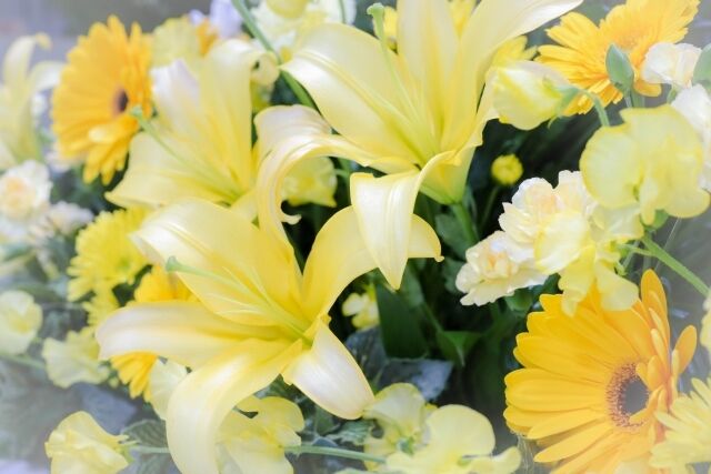 - 家族葬(一日葬・二日葬)一般葬ともに「選べる花祭壇」をご用意。デザイン、色合いをプロデュースいただけます。