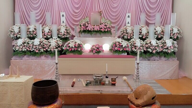 かわさき北部斎苑での家族で送る一日葬のお手伝いです。可愛らしいピンクで統一した花祭壇と空間が印象的でした...