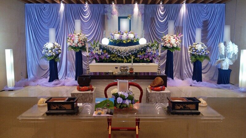 | 葬儀社の担当者コメント | お元気になられたら旅行に行く予定も、願いかなわずに旅立たれた故人様へ旅行予定先のメモリーズをお創りいたしました。式場全体は柔らかな紫のグラデーションで飾り、厳かでありながらもどこか温かみのある空間となりました。ご参列の皆様からは「故人様らしい、穏やかで美しい祭壇ですね」とのお言葉をいただき、ご家族も「静かにゆっくりとお別れができました」と安心されたご様子でした。 |