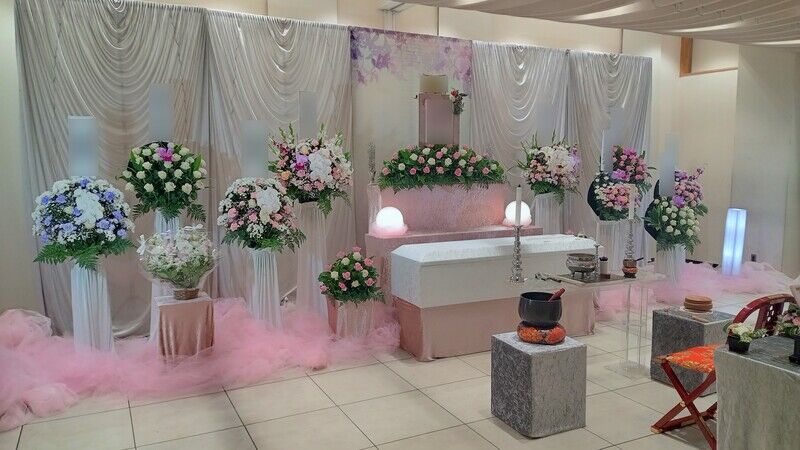 かわさき北部斎苑での家族で送る一日葬のお手伝いです。可愛らしいピンクで統一した花祭壇と空間が印象的でした...