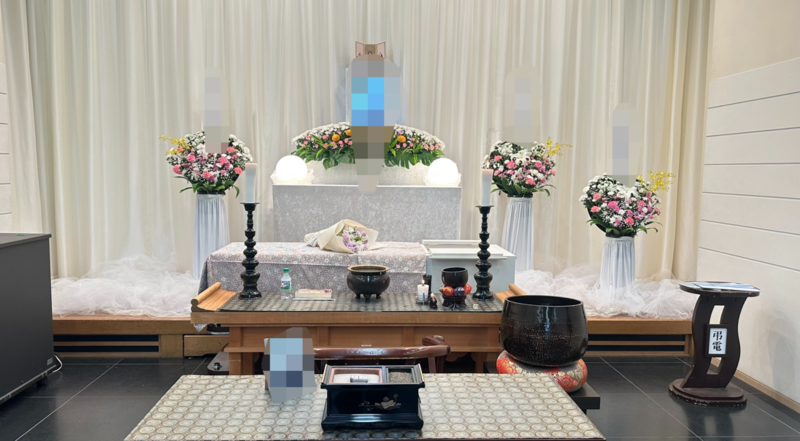 家族親族らのみを呼ばれての一日葬です。白色を基調とした式場にたくさんの生花を出され、他の誰にも邪魔されな...