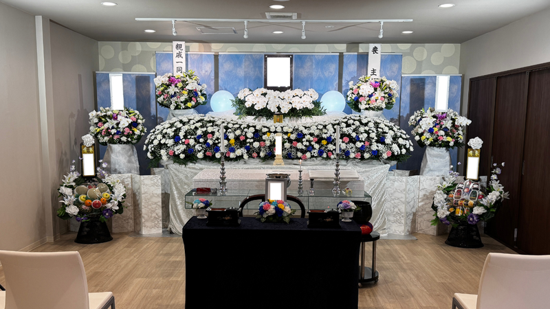 今回のご葬儀では、祭壇を青と白を基調にお飾りし、故人様が愛された故郷の自然を思わせるような雰囲気で祭壇を...