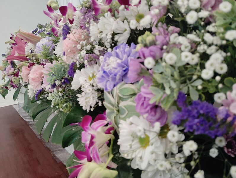 無宗教でお花をたくさん贈りたいとの事でしたので、ご提案させて頂きました。 お棺の中に入れてあげたい物も事前にご用意頂いてご家族様も気持ち良くお送り頂けたと仰って頂いたこととても嬉しく感じました。 |