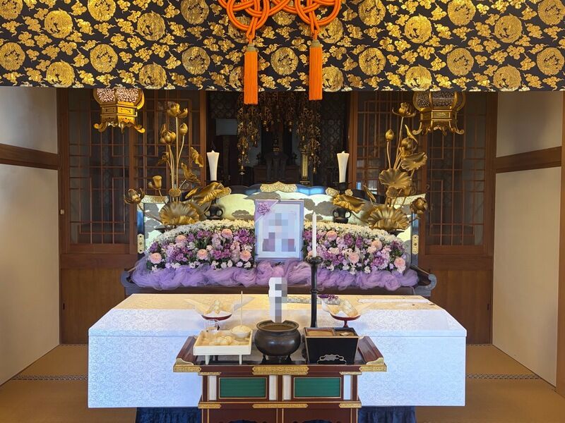 本堂内の須弥壇に綺麗な生花祭壇を設営し、一日葬として施行いたしました。 返礼品も当日半返しまでさせてい...