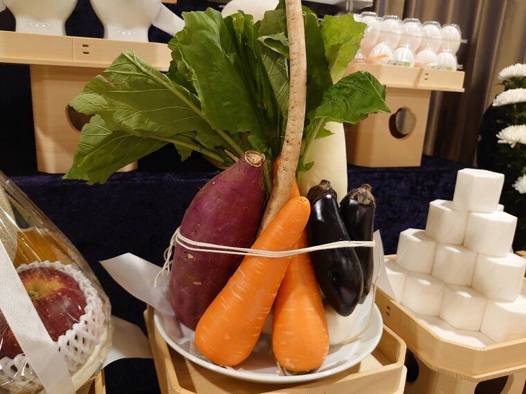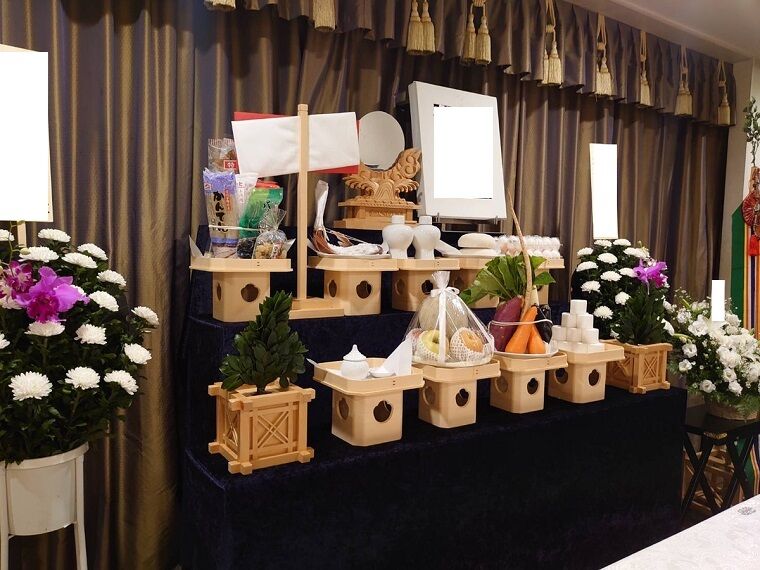 神道の葬儀のことを神葬祭(しんそうさい)といいます。 神葬祭は故人を子孫の家に留めて守護神になってもらうための儀式という意味合いがあります。 仏教の葬儀のお供えとは少し異なり、 米、酒、餅、魚、乾物、野菜、果物、酒、水などをお供えします。 |